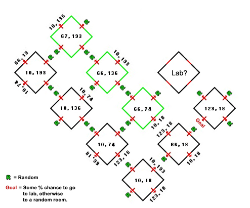 • This is a map of the cuberoom maze (unless its changed). The portals marked R moves you to a random one of the three green marked rooms. You'll actually start in one of those 3 rooms too. To make it slightly more random, the exit portal doesn't always actually take you out of the maze, you may have to work your way back again.