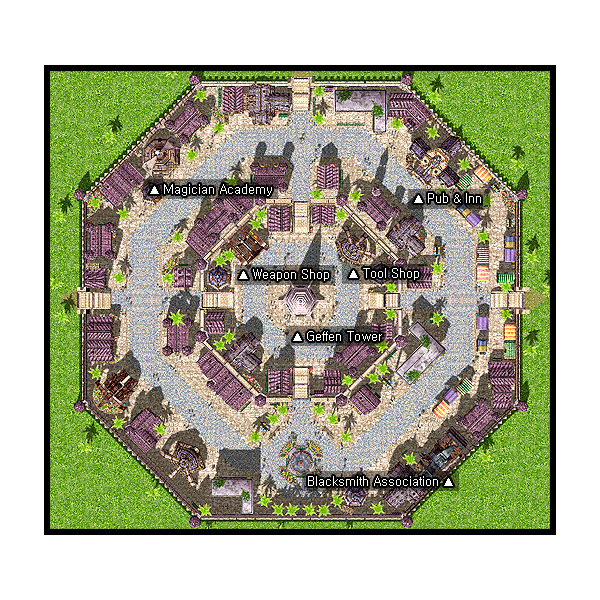 - Shows Magic Academy, Forge Shop, Weapon Shop, Tool Shop, Pub, Inn, Geffen Tower on minimap