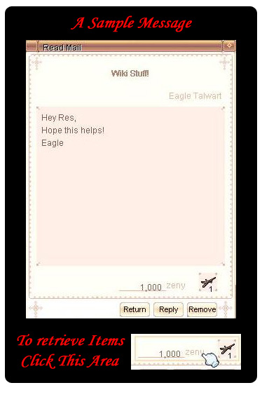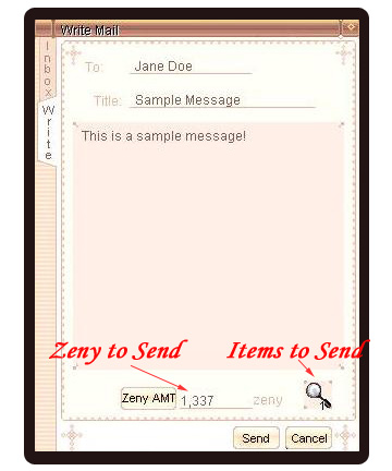 - Zeny and Items (1 item stack per message) can be sent via the Mailing System.