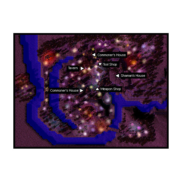 Shows Witch's castle, Tool Shop, Weapon Shop, Pub on minimap