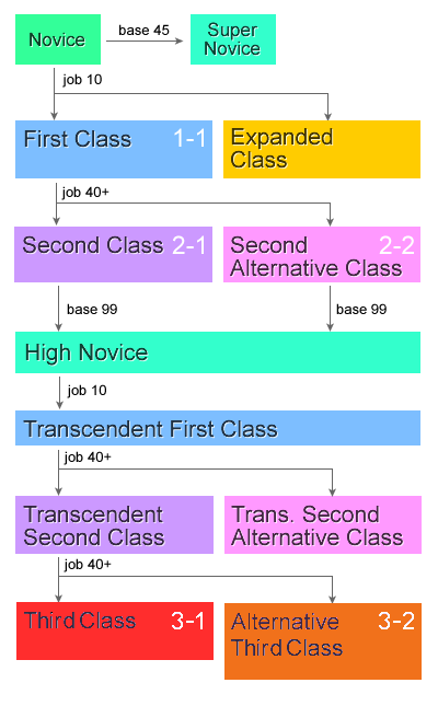In Ragnarok Online, a character's abilities and skills are defined by their class (also known as job). Characters start out as Novices, then once they reach job level 10 they can choose between a variety of first job classes. Once they then reach at least Job Level 40 they can then change to a second class job, either 2-1 or 2-2. Then after reaching Base Level 99 and Job Level 50 as a second class they can choose to transcend and start the process again, being rewarded with a more powerful, transcendent character. Alternatively, from Novice, players can choose to become the ultimate Novice, the Super Novice, or explore one of the Expanded classes.