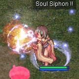 Grants a chance to fully drain the SP amount of a target. If this skill succeeds, the target's SP will be fully drained. When this skill is mastered at Level 5, Soul Siphon will also inflict twice as much damage as the target's SP amount; however, if it fails, the caster will receive an amount of damage equal to twice the caster's SP amount.